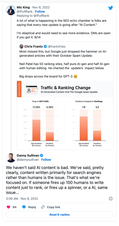 대니 설리반의 트윗은 구글이 AI로 작성된 콘텐츠에 대한 구체적인 가이드라인을 가지고 있지는 않지만, 이러한 콘텐츠가 사람이 작성한 콘텐츠와 동일한 기준을 충족할 것으로 기대한다는 점을 명확히 했습니다. 즉, AI가 생성한 콘텐츠는 유익하고 관련성이 높으며 독자에게 도움이 되어야 합니다. AI를 사용한다고 해서 콘텐츠의 품질이 저하되거나 어떤 식으로든 독자를 기만해서는 안 됩니다.