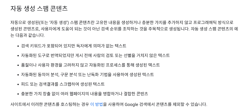 구글은 자동 생성 컨텐츠에 대한 스팸처리를 위와 같은 가이드라인으로 규정 하고 있습니다.